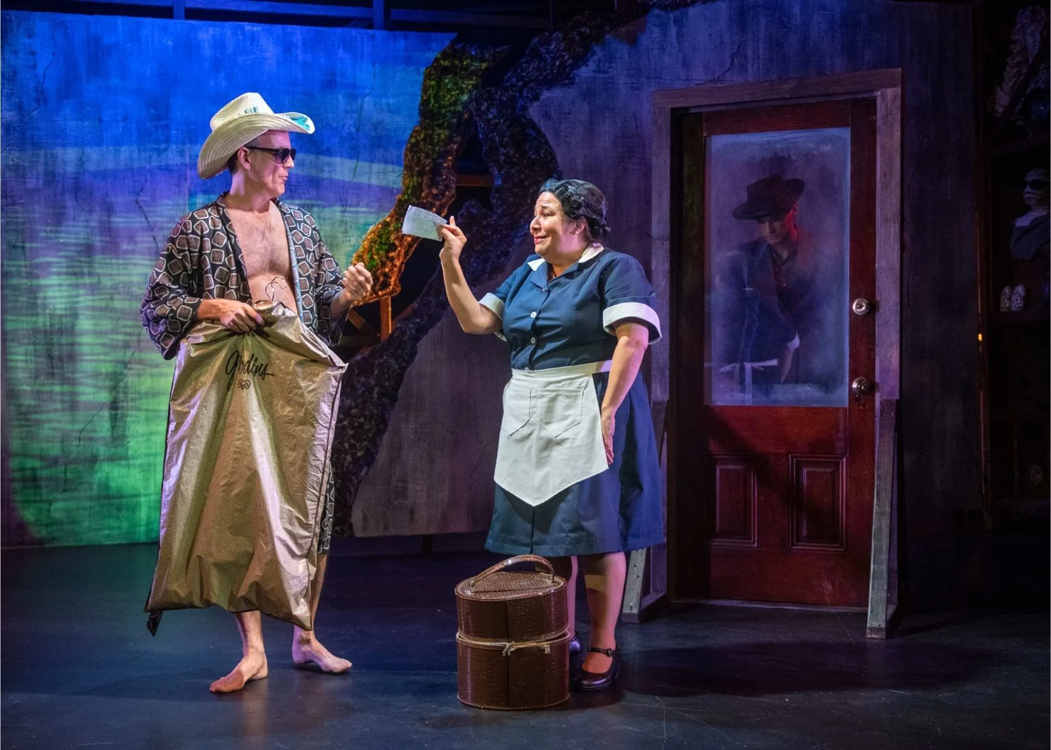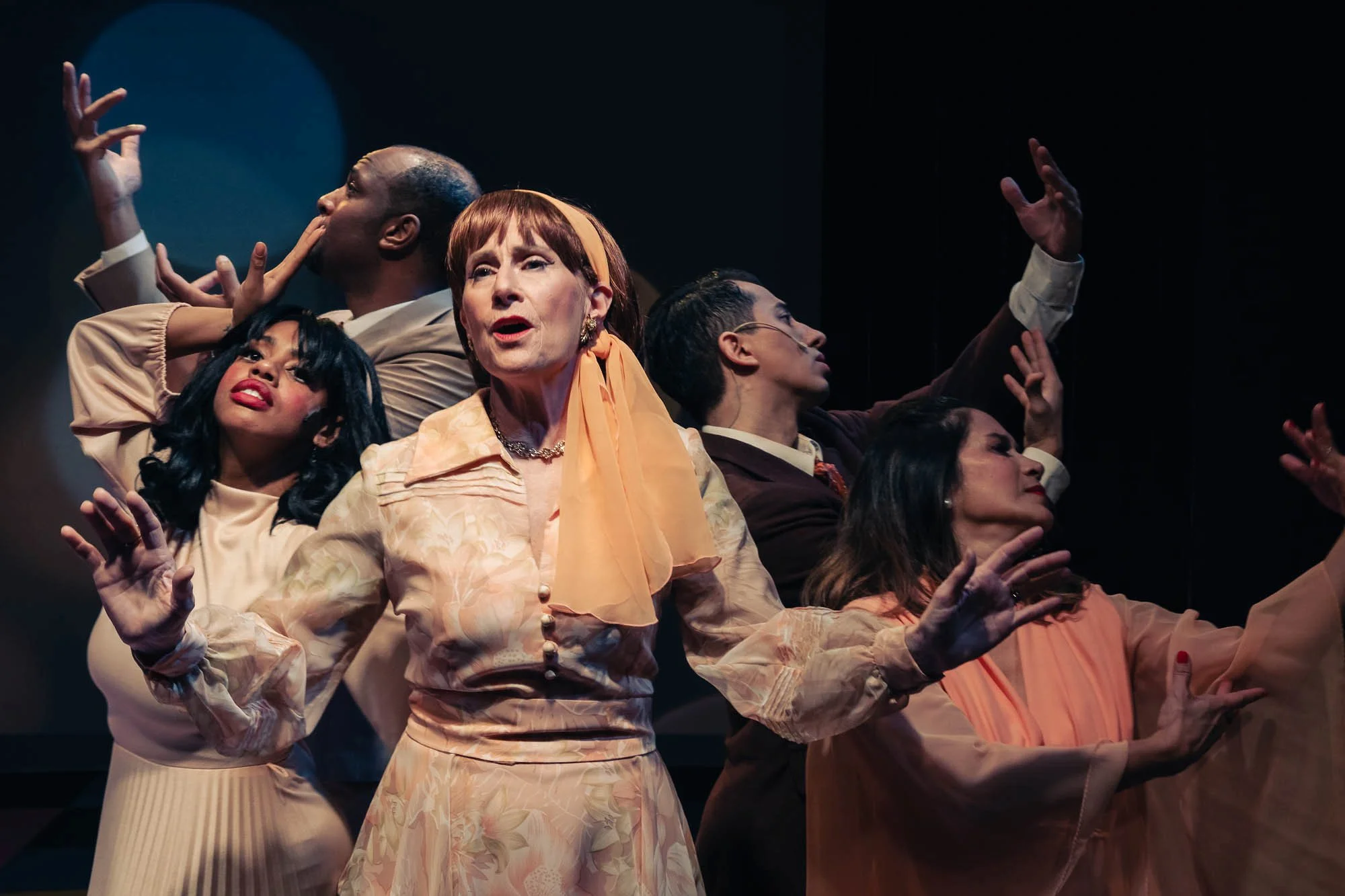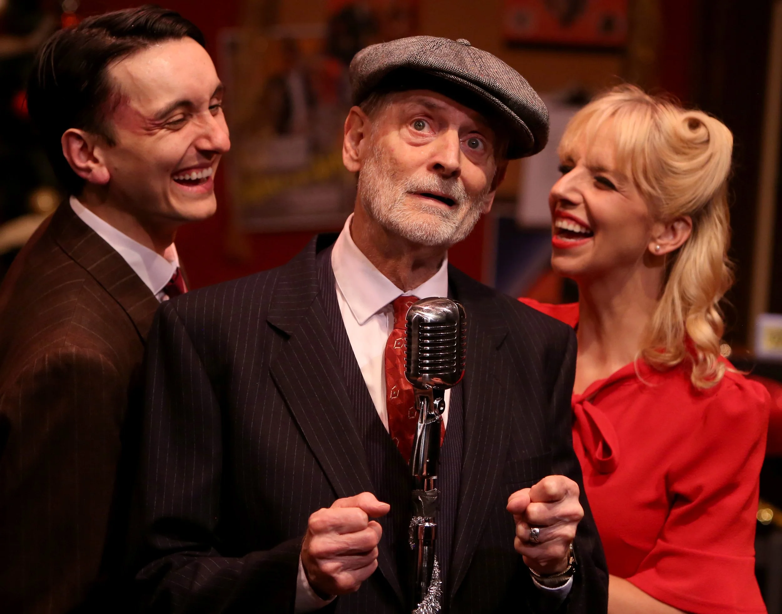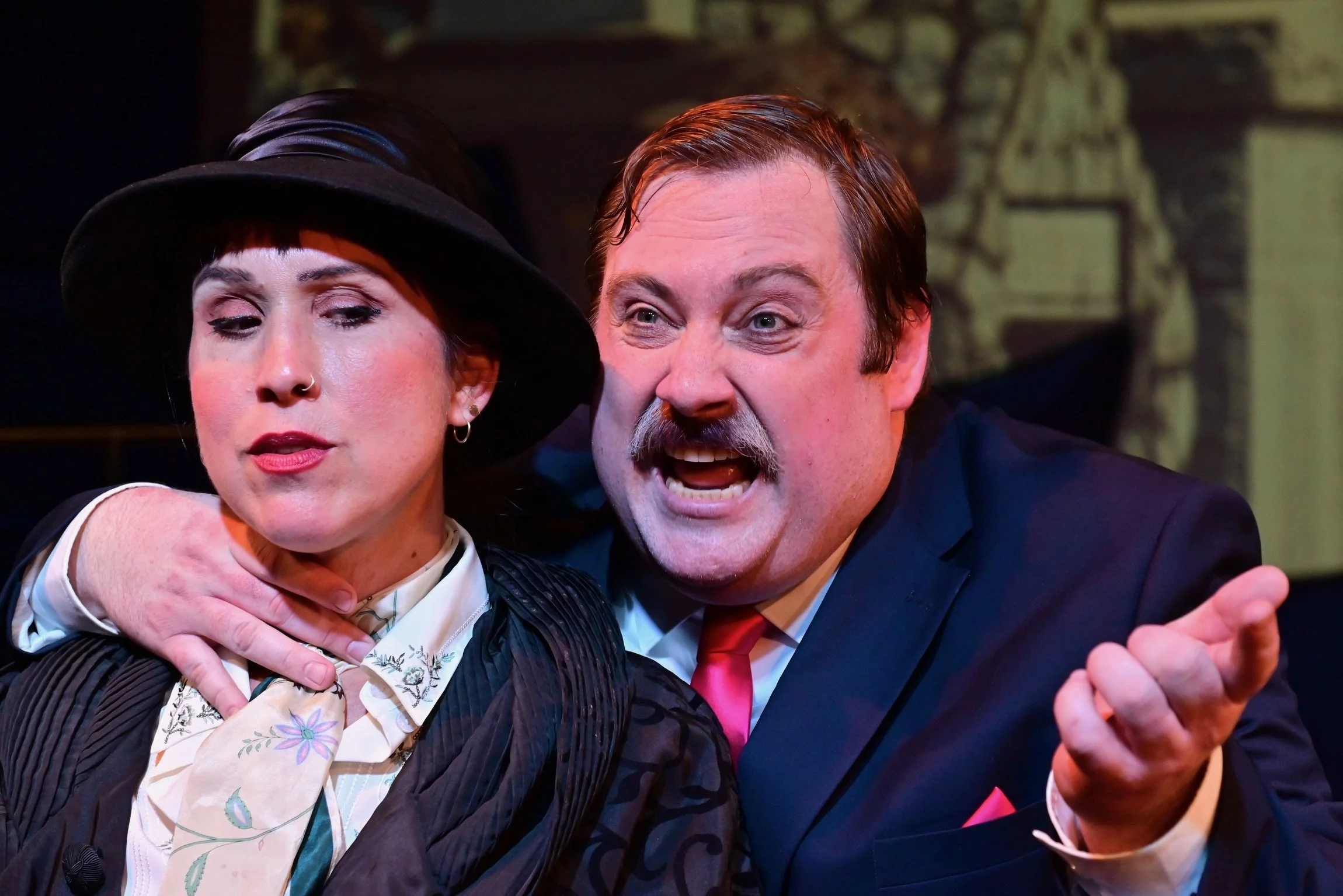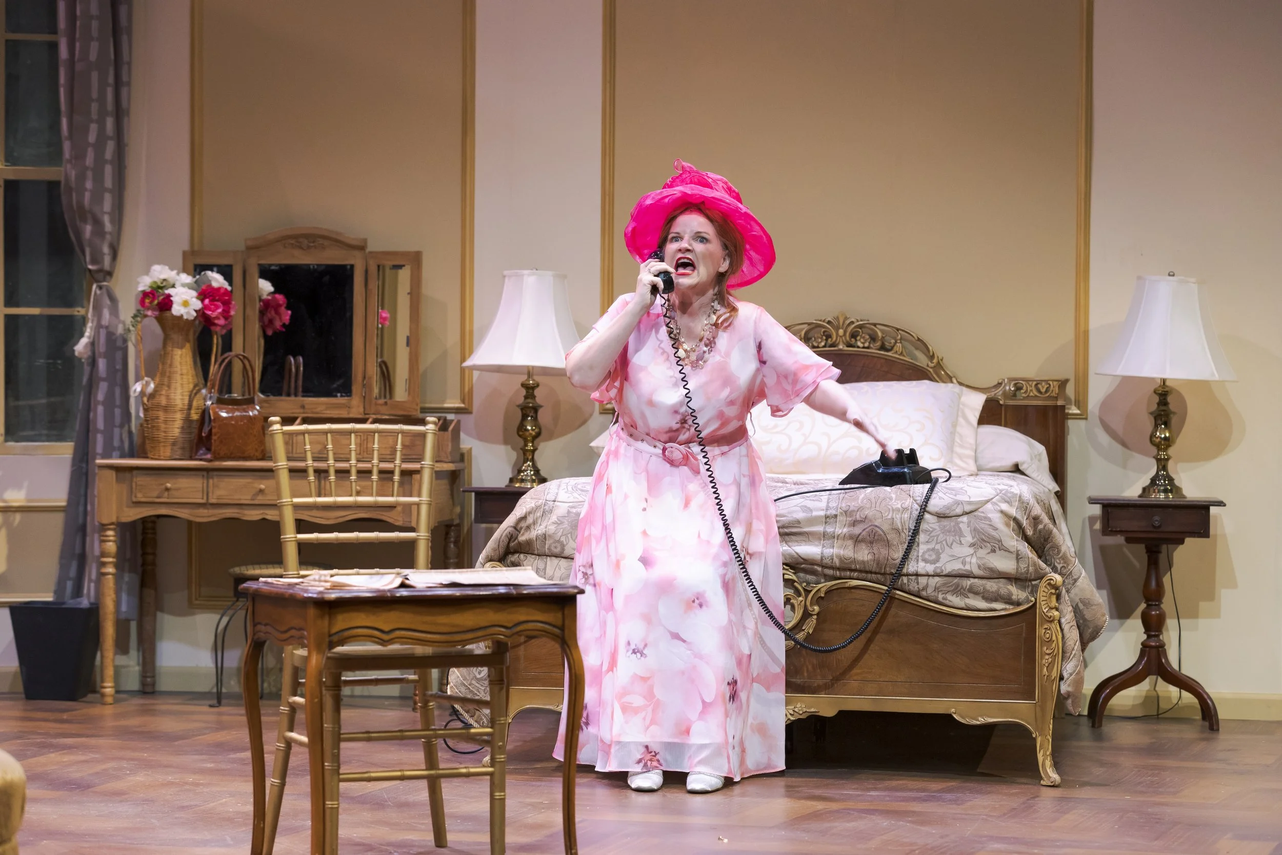 Dana Lewenthal’s Celeste Fielding, the comedic diva we love to hate, turns up the heat. Celeste first appears draped in a full-length fur coat. She blusters with sweeping comic gestures, demanding recognition.