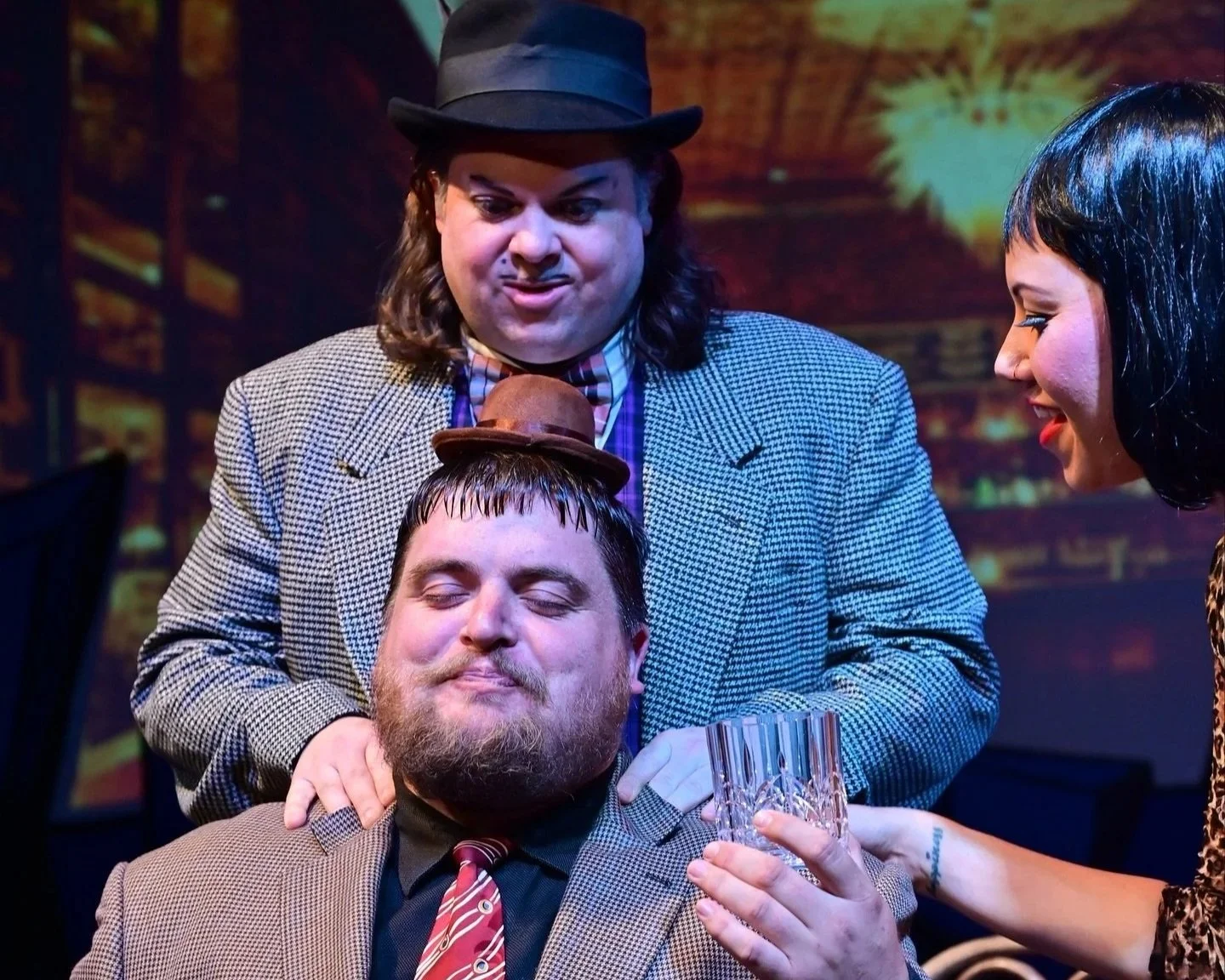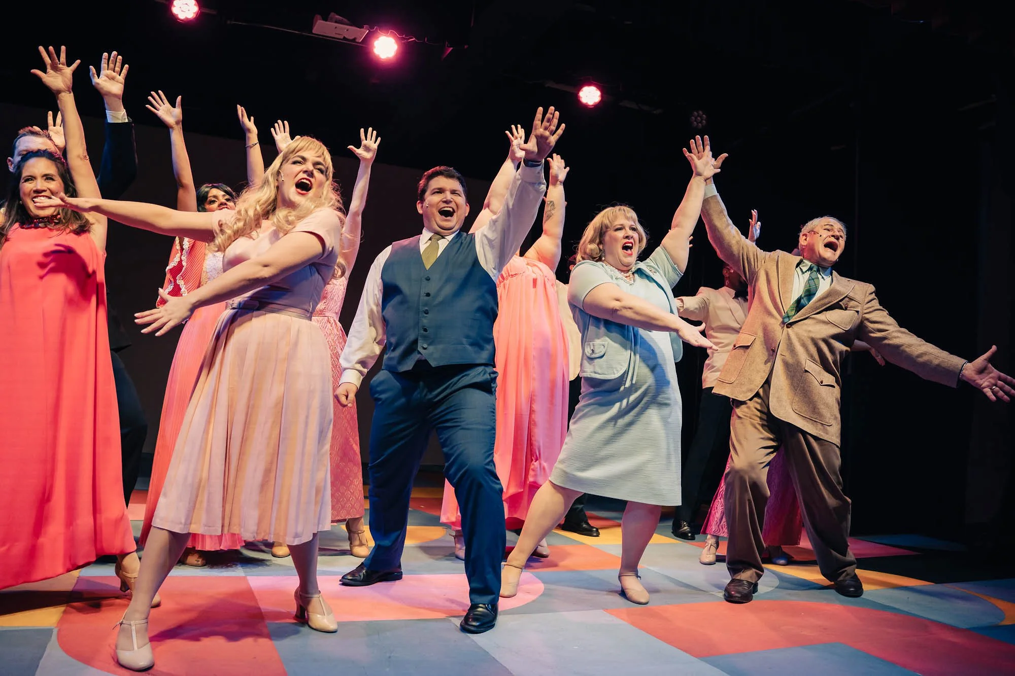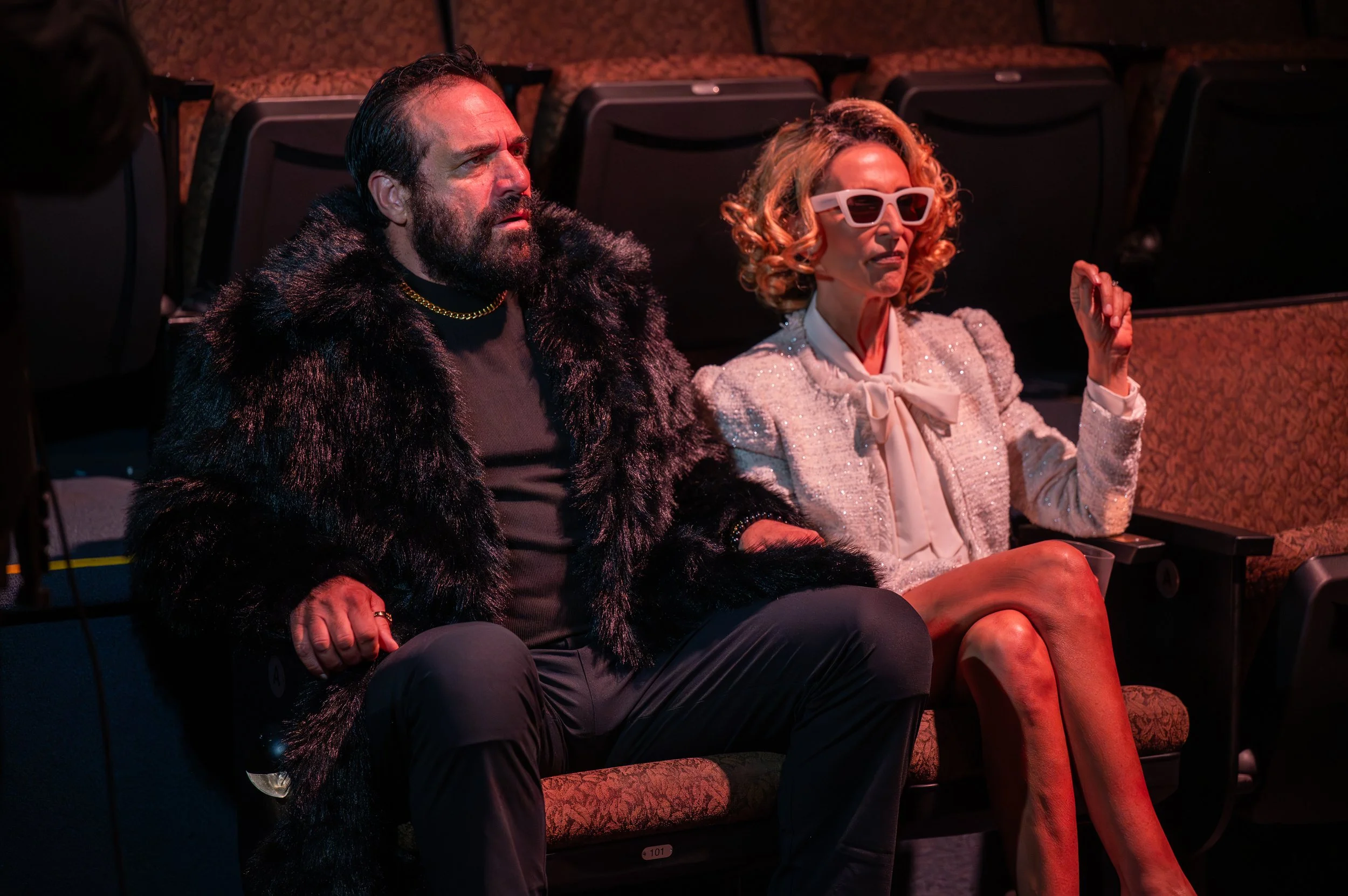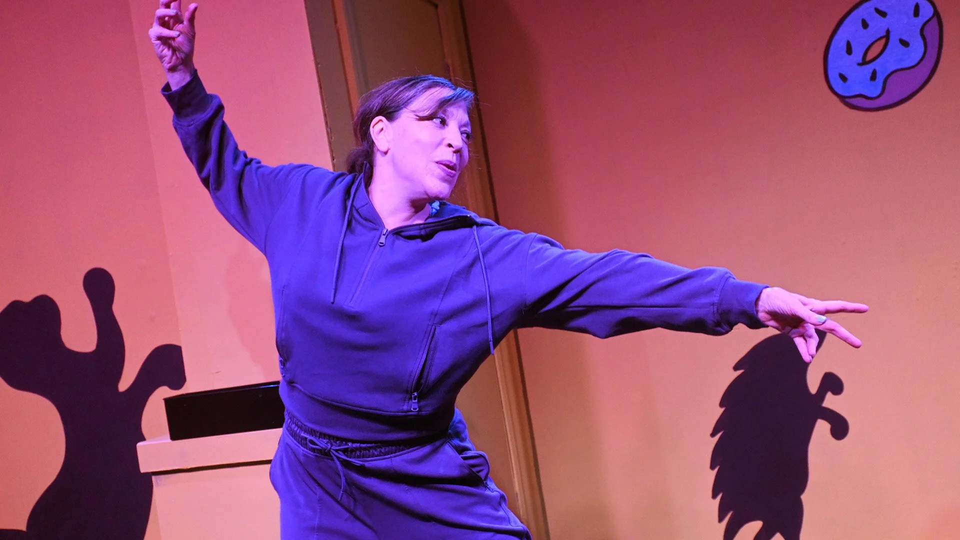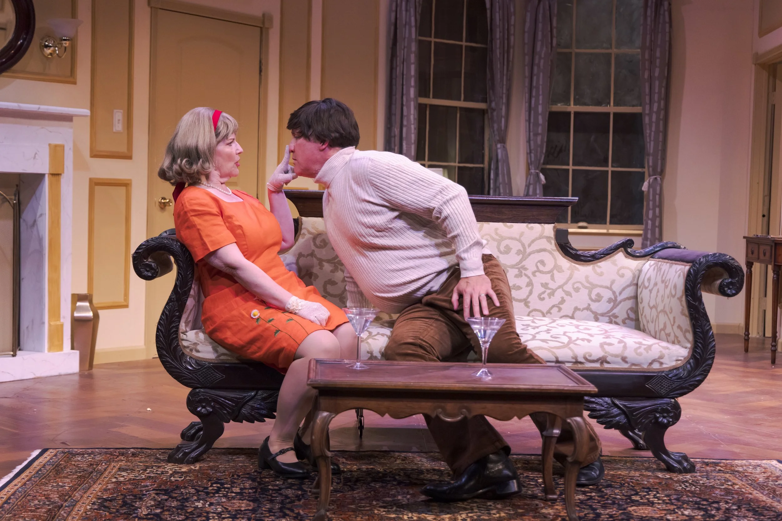 Dana Lewenthal’s Celeste Fielding, the comedic diva we love to hate, turns up the heat. Celeste first appears draped in a full-length fur coat. She blusters with sweeping comic gestures, demanding recognition.