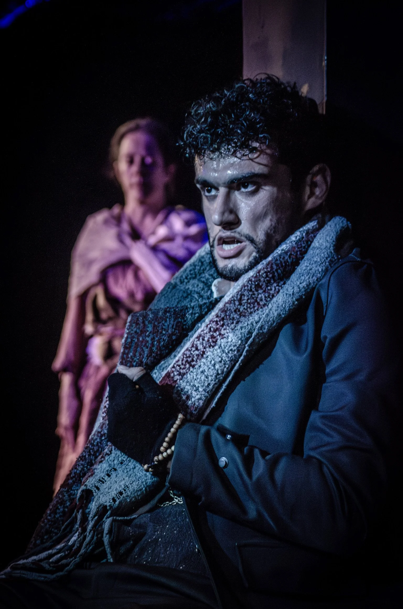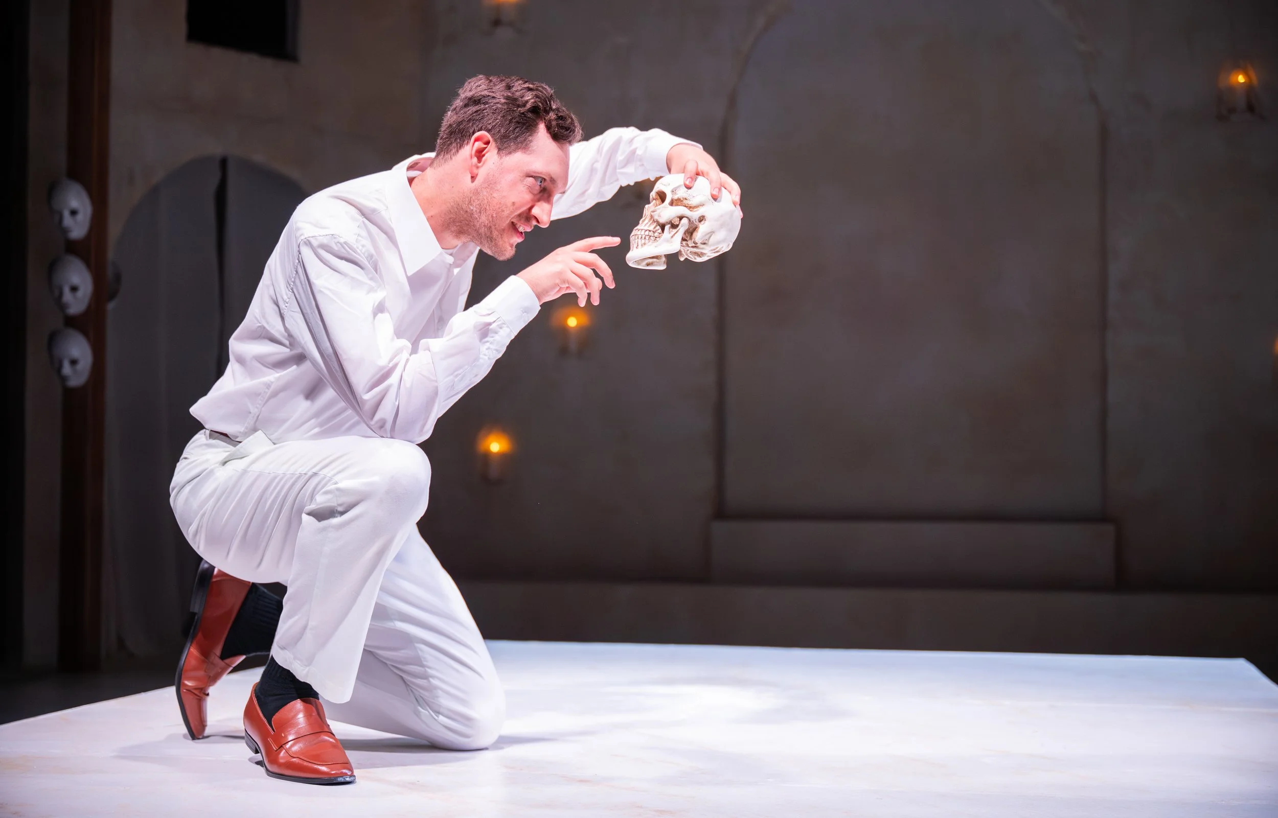 Stuart’s unfolding intensity feels like a horror film. In this symbolic show, there are no props, just sound to indicate her destructive acts. As an elegant, spoiled lady, she cannot comprehend Martin’s utter degradation. Their privileged world shatters because it’s too perfect.