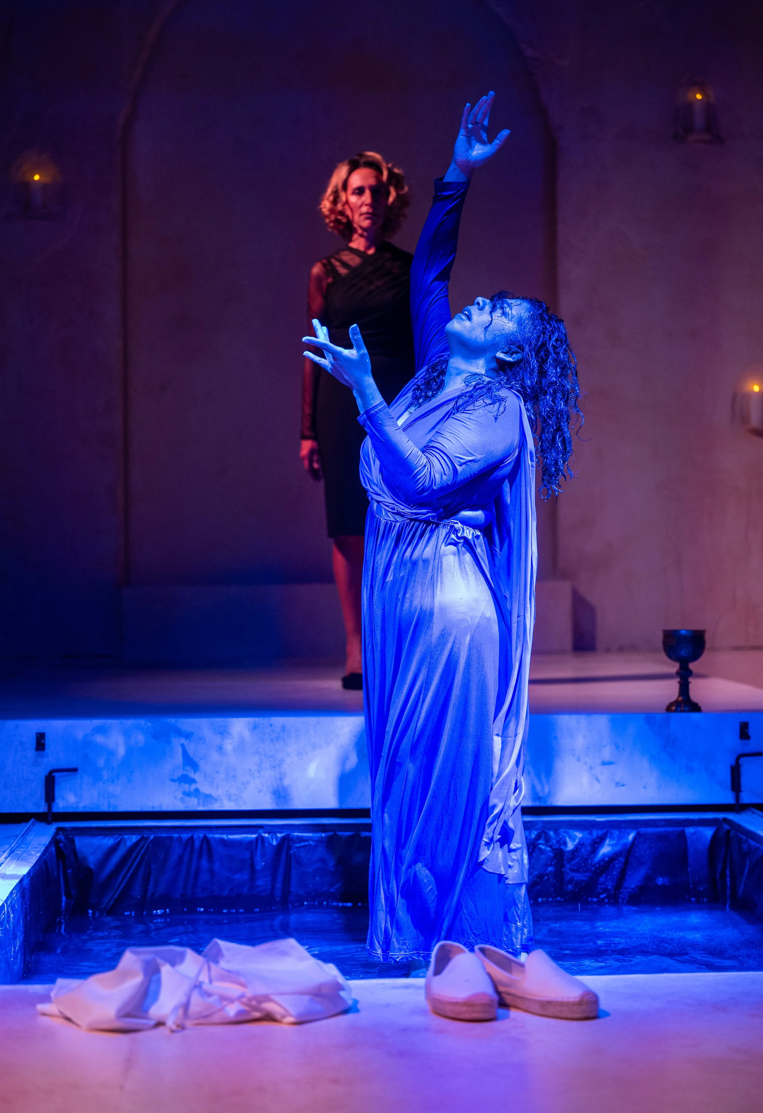 Macbeth chats to us, and Castellanos displays mischievous unrest with a delicious, casual delivery, as if hanging out with us. Castellanos’ engaging manner breaks apart not only Macbeth’s character, but also Shakespeare’s language in this new adaptation. Playwright Cruz has translated Shakespeare’s words into a streamlined, user-friendly script for this 95-minute performance.
