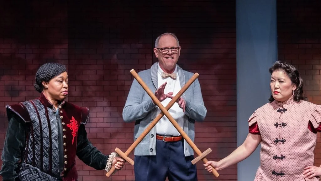 Stuart Lasker (Gregory Lynch), the gay Stage Manager, gets to play Mistress Quickly hilariously, in drag. In a world that deems him unfit to serve, he finds purpose, belonging, and dignity among women who are actively redefining their roles.