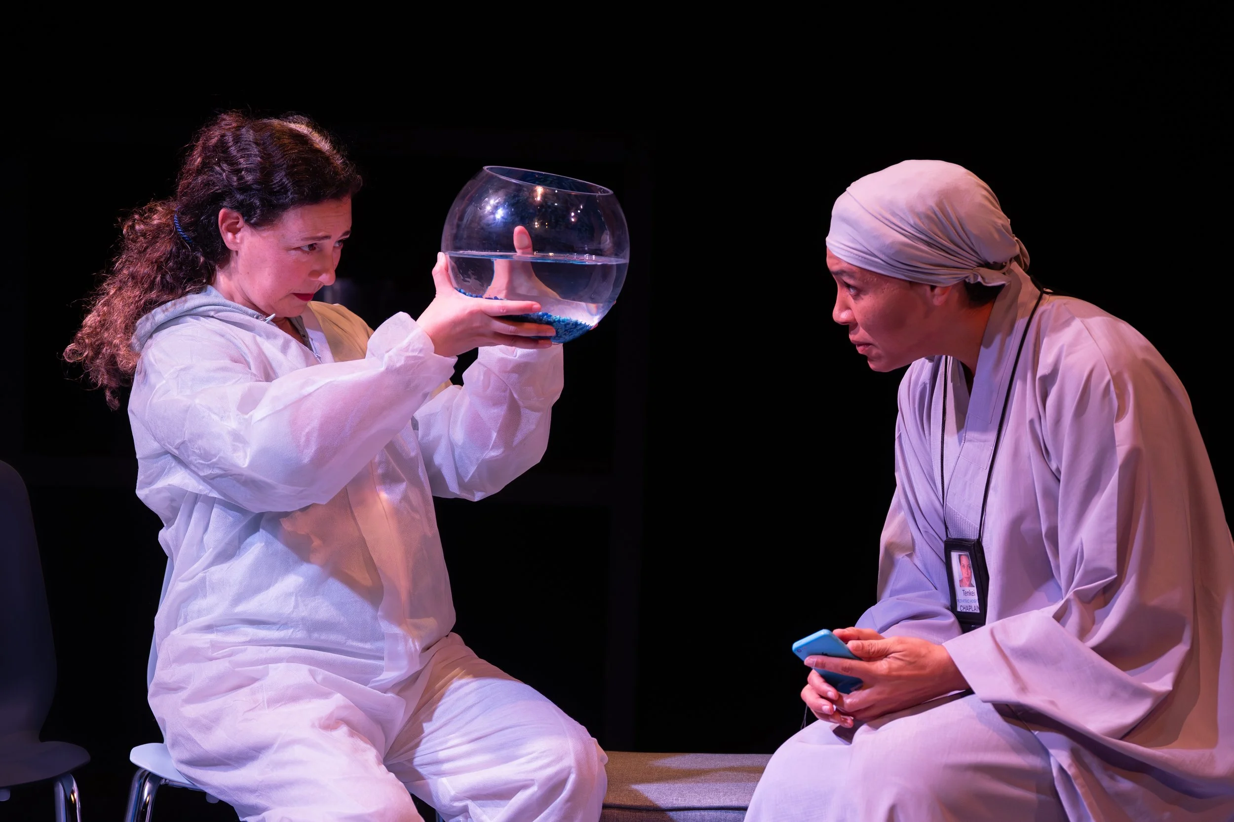 Liliana Duque Piñeiro’s elegant single-wall set and Sharon Peng’s loose white clothing suggest Greek tragedy. Their elite offense is arrogance in over-insulated lives.