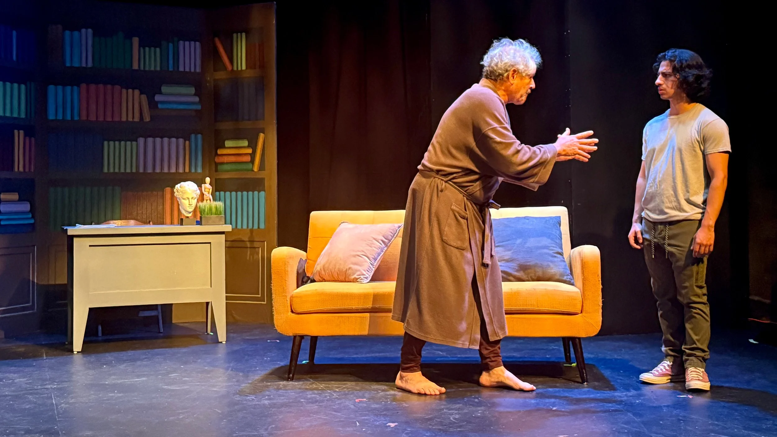 Formidable Grandma Kurnitz (powerful Ellen Ratner) enters through the central arched hallway of Deanna Zibello’s impressive set. Grandma plods toward her ‘throne’ to size up her estranged grandsons. “Which is the smart one?” she asks in a German accent. Her notorious walking cane serves as warning and weapon.