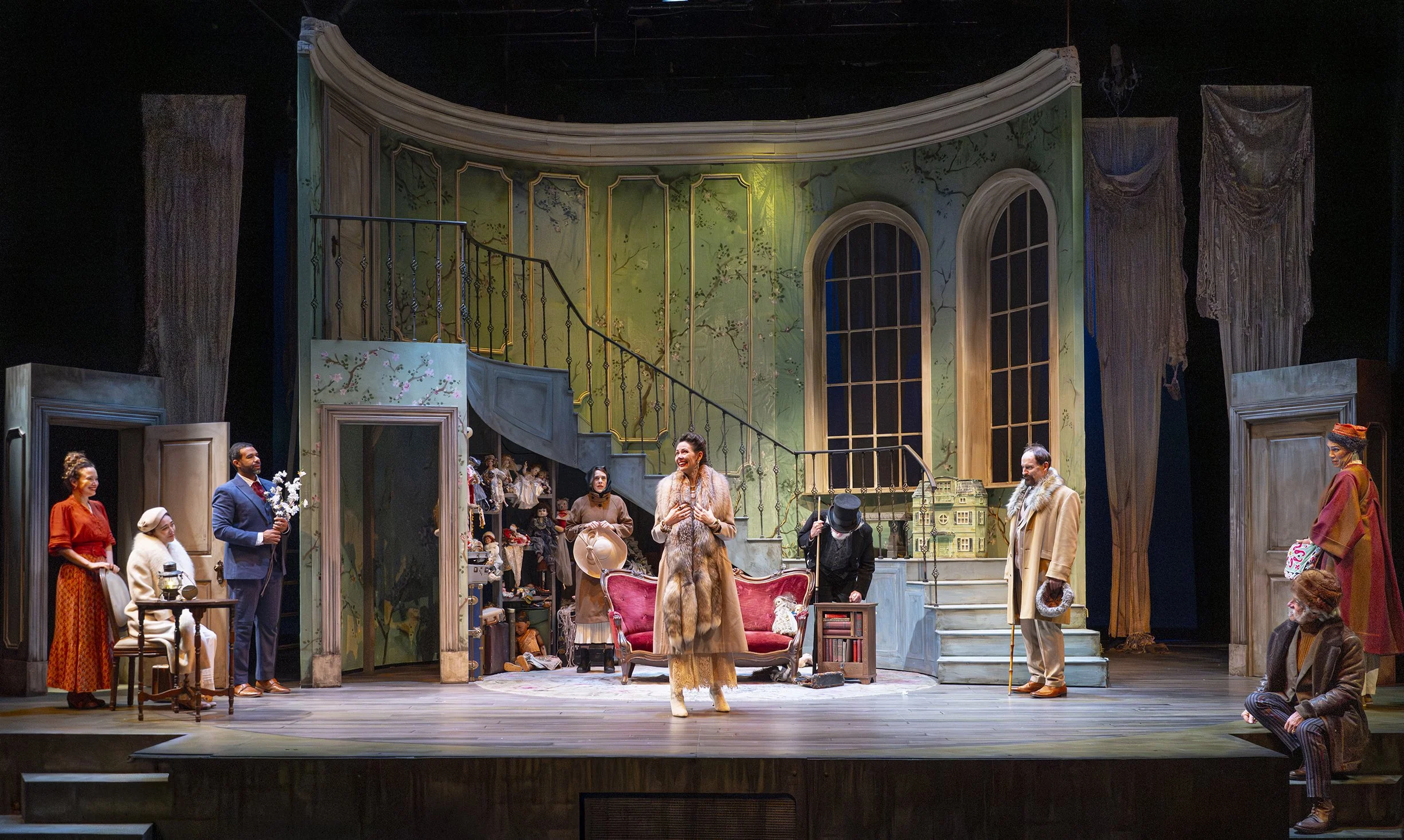 As designer Nina Ball’s superb, detailed set revolves, it reveals the stone walled flower market outside Convent Garden; then Higgins’s house and study, an imposing facade “on the street where you live.” It’s almost like turning the pages of a book as the stage turns. The craftsmanship is evident in every setting from the street to the winding iron staircase in Higgins’ upper room.