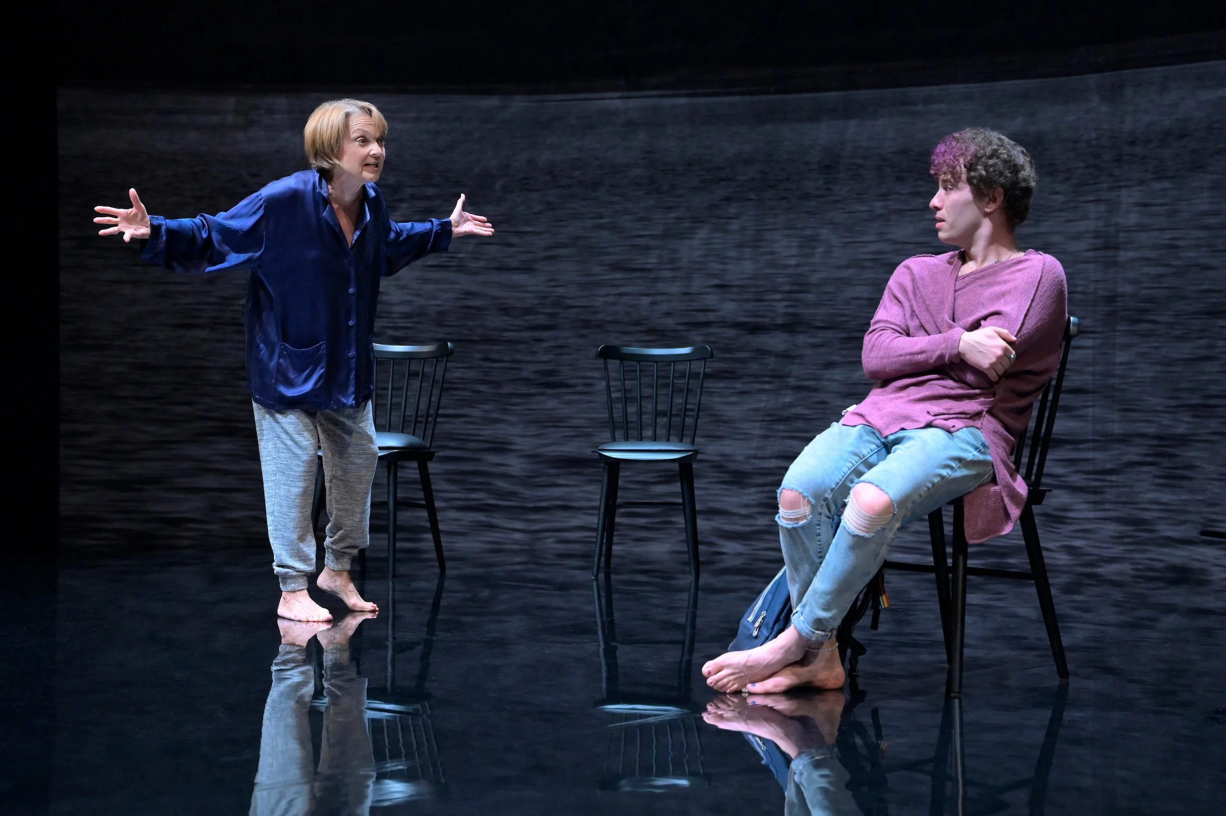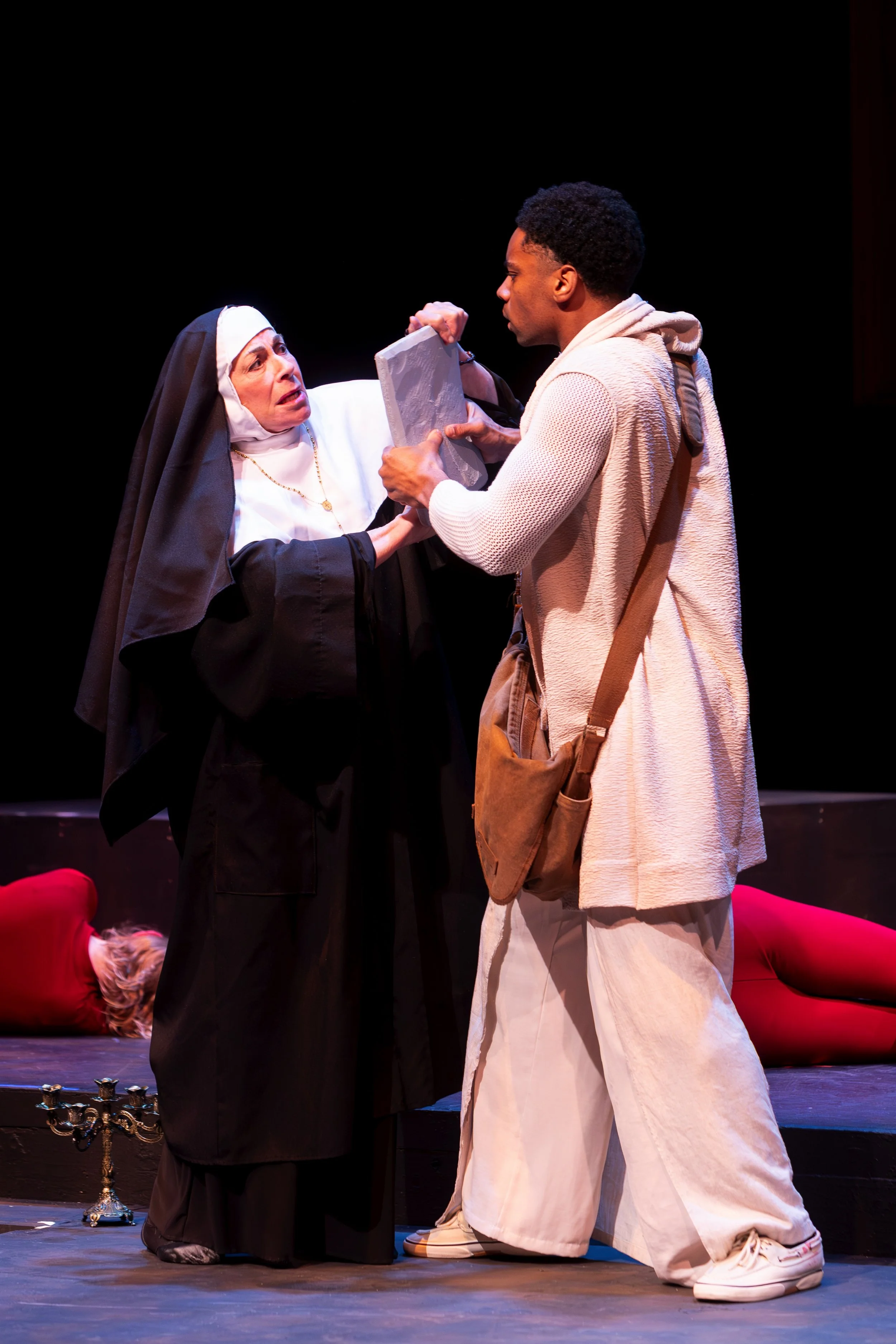His mom refuses but sister Bella announces that the boys WILL stay, standing up to her mother in a glorious act of defiance. Rogoff imbues Bella with such depth of feeling that when she cries out to be held, we ache with pain for the broken woman-child. When Bella’s sister steps in, we feel the rush of love that their mother cruelly denies.